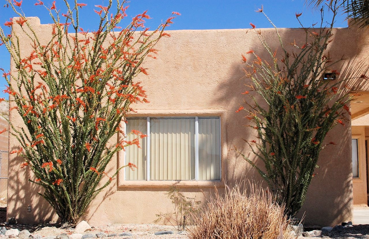 ΥΓ Τα φυτα στις παραπανω φωτογραφιες ειναι (α) στην πισω αυλη, Βραζιλιανη περικοκλαδα "Τα νυχια της γατας", Cat's claw (Uncaria tomentosa) η οποια μετα τον 3ο χρονο απο το φυτεμα, ανθιζει καθε ανοιξη με μεγαλα κιτρινα λουλουδια (β) στην εξωτερικη αυλη πλαϊ απο το γκαραζ, Ocotillo (Fouquieria splendens) φυτο της ερημου, συνανταται στις νοτιοδυτικες πολιτειες και στο βορειο Μεξικο. Οταν ανθιζει προσελκυει δεκαδες Hummingbirds που απολαμβανουν το νεκταρ των λουλουδιων.